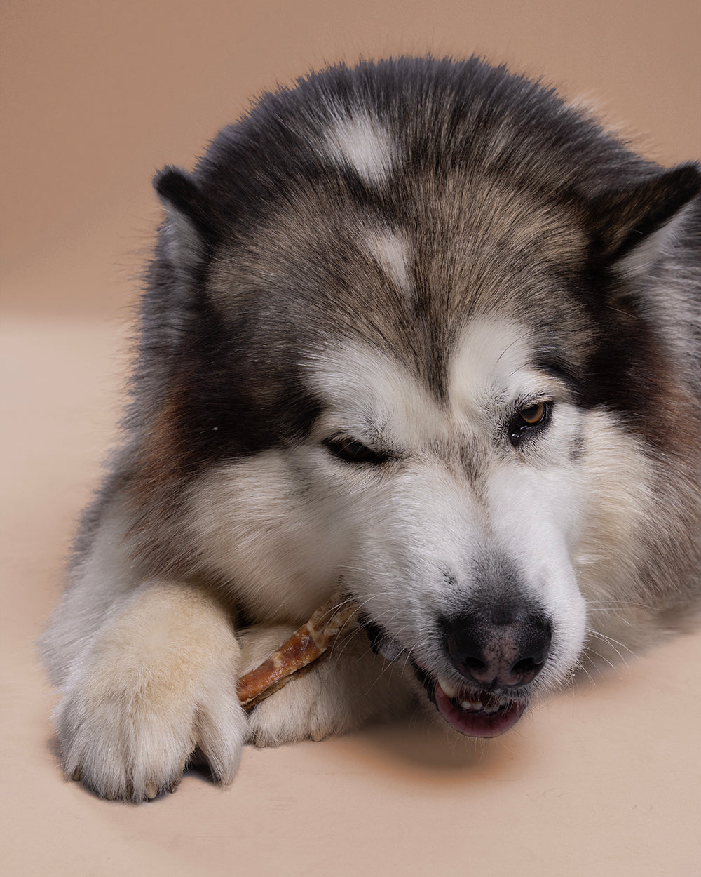 Carne di salmone 44.8%, carne di pollo, farina di frumento, amido di mais, proteine di pisello, proteine di arachidi, glicerolo.